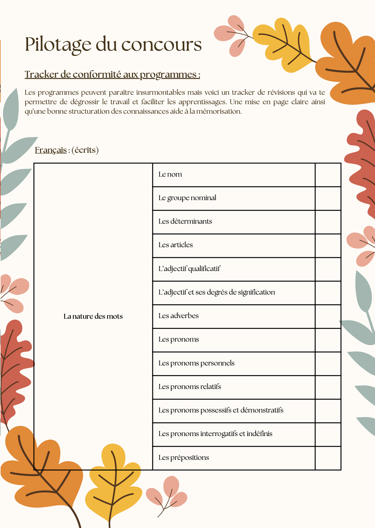 Français (Écrits) : Un tracker ultra-détaillé couvrant la nature des mots (nom, adjectifs, pronoms…) , la syntaxe de la phrase , les fonctions , l’orthographe grammaticale et le lexique.